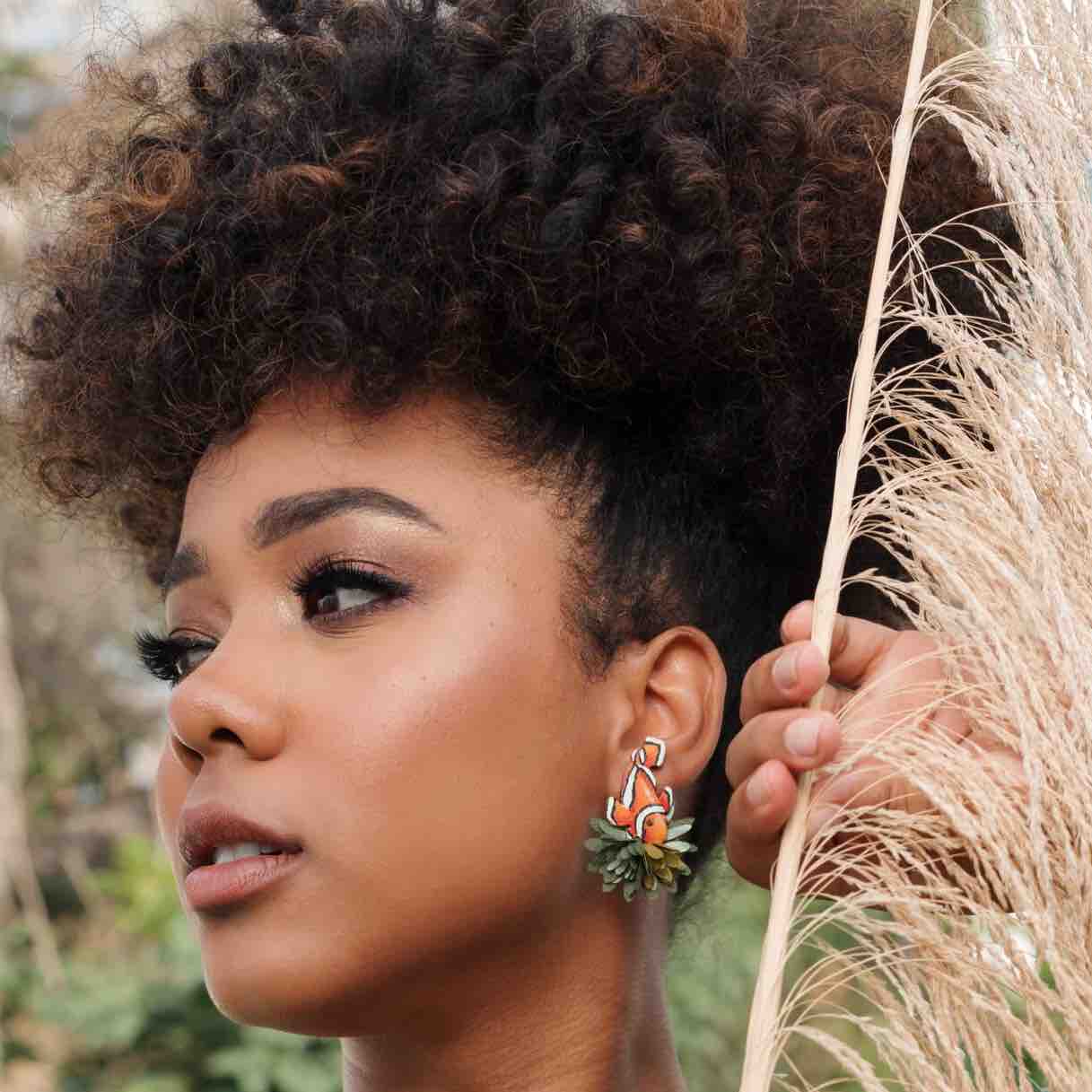 Combined with natural fabric layers, the Clown Fish earrings create a bold yet refined look, transforming plant-based materials into wearable art.