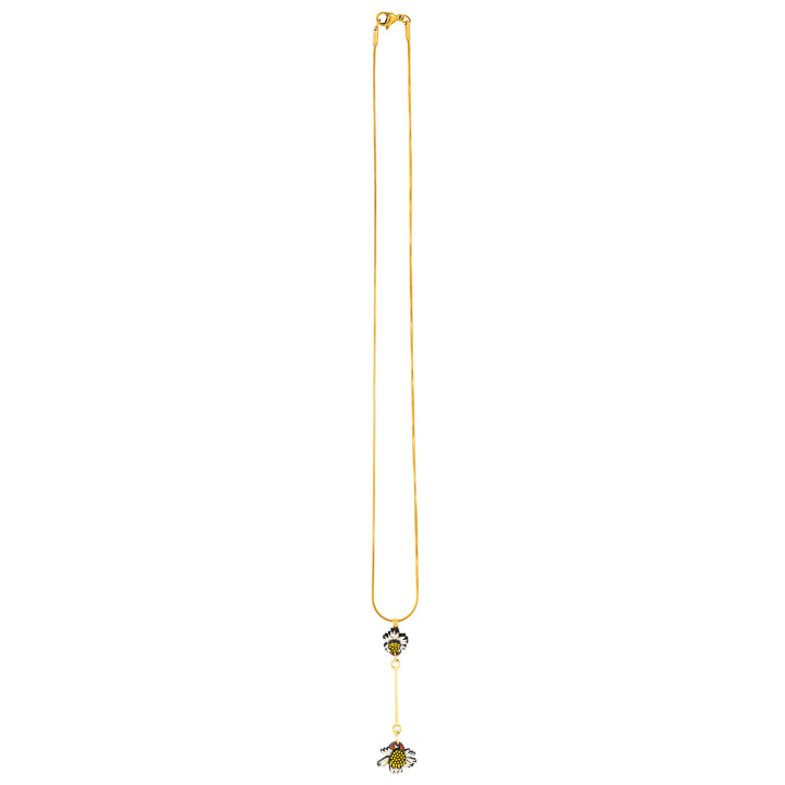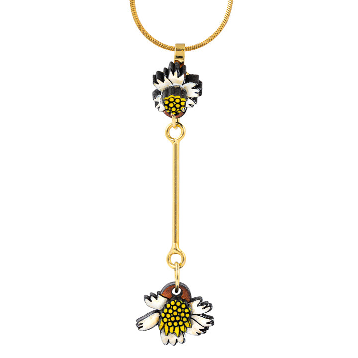 Paguro Upcycle reclaimed wood necklace with black and white floral design on gold chain