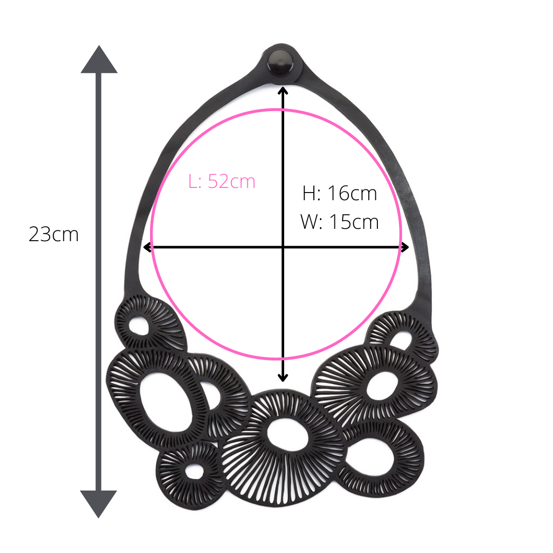 The recycled rubber is retrieved from old industrial printing machines. When the printers reach the end of their lives, they will be broken up and sold for scrap. We reclaim the rubber belts and use them for jewellery instead. With variations in texture and colour, all of the pieces are unique.